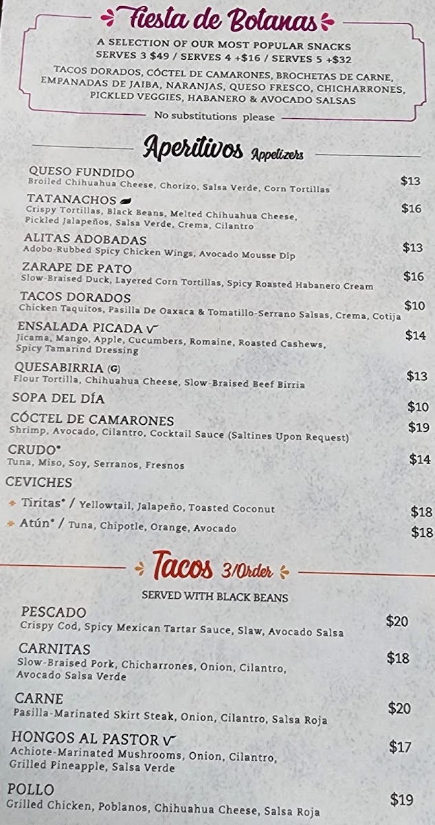 Expect a variety of dishes that balance comforting and vibrant elements. Highlights like rich Birria De Res paired with sweet Plantanos, fresh Guacamole & Chips alongside a lively Salsa Roja, or the layered flavors of Enchiladas Suizas showcase the range of options. There are also standout tacos—such as Carne Tacos and Carnitas Tacos—that work well whether you’re looking for a quick bite or a satisfying entrée.